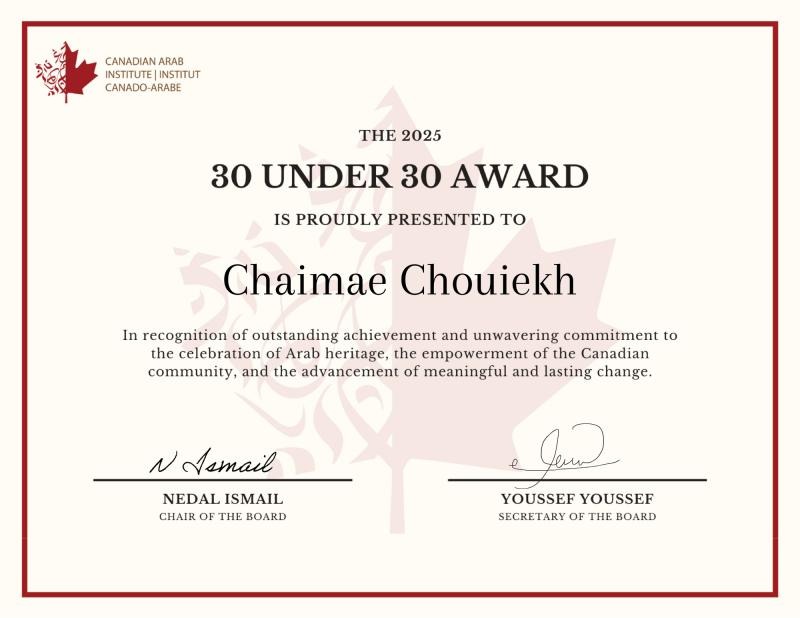 The prestigious "30 Under 30" award recognizes and honours the remarkable contributions of young individuals who embody and exemplify excellence, leadership and a deep commitment to their Arab heritage. The award showcases the achievements of Arab Canadians who have gone above and beyond in their respective fields, leaving an unforgettable mark on our community.